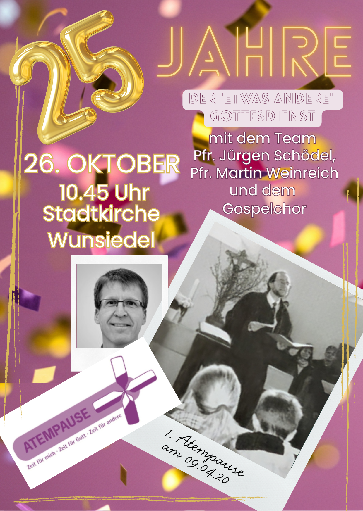 Highlights im Oktober 2025 in der Stadtkirche Wunsiedel 9. Oktober 20259. Oktober 2025 Karin Neuper-Schenkl Gospel Konzert am 18. Oktober in der Stadtkirche Wunsiedel Sonntagsinsel mit der Feuerwehr am 19. Oktober in der Stadtkirche 25 Jahre Atempause - der etwas ander Gottesdienst hat Jubiläum am 26. Oktober