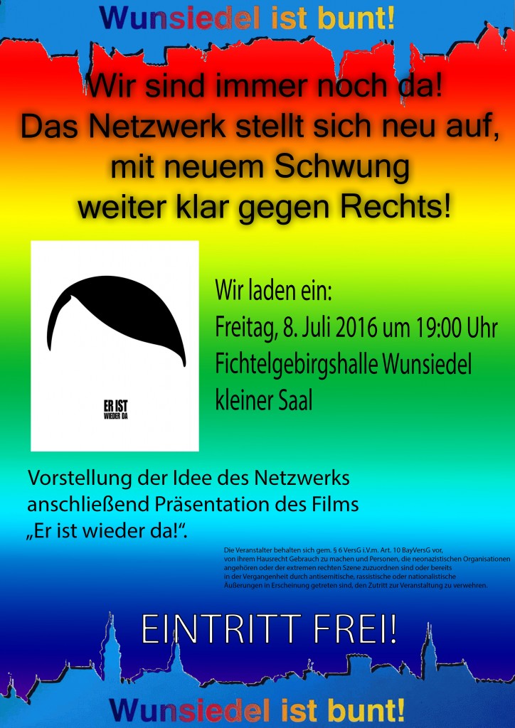 ich darf Euch mitteilen, dass am Freitag, 08.07.2016 um 19:00 Uhr im kleinen Saal der Fichtelgebirgshalle das nächste Treffen der BI „Wunsiedel ist bunt“ stattfinden wird. Großes Thema wird sein, dass der Sprecherrat die über lange Zeit gewachsenen, derzeit bestehenden Bündnisse und Initiativen zu einem Netzwerk „Wunsiedel ist bunt“ zusammenfassen möchte.